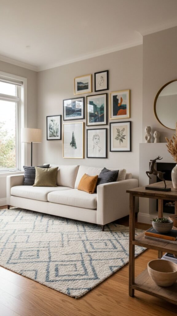 - Mix framed art with 3D objects like small sculptures or plants