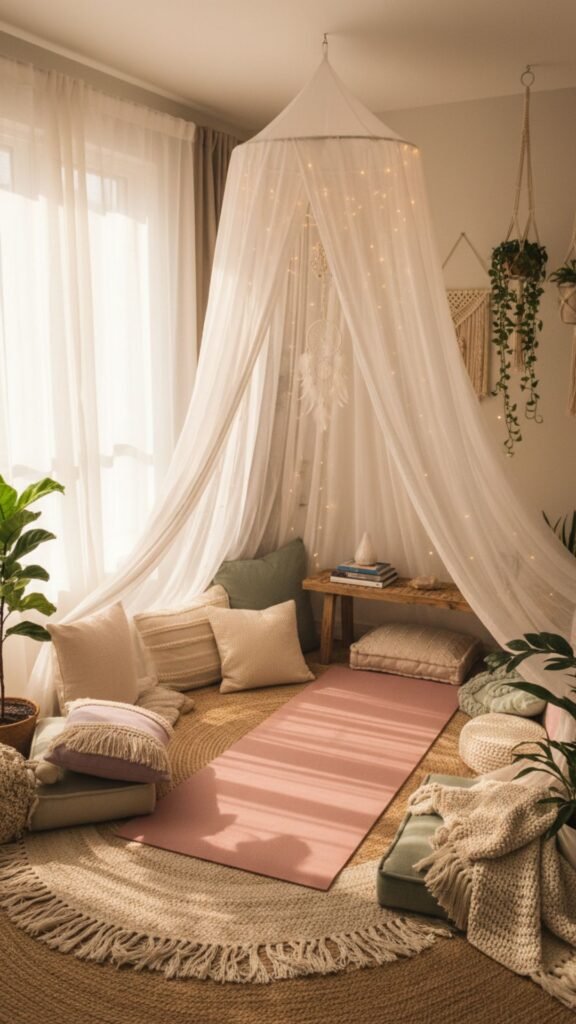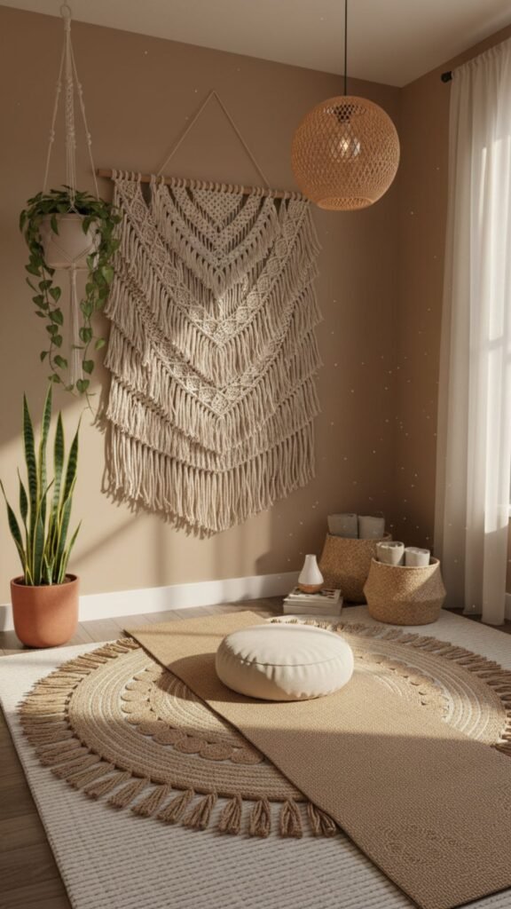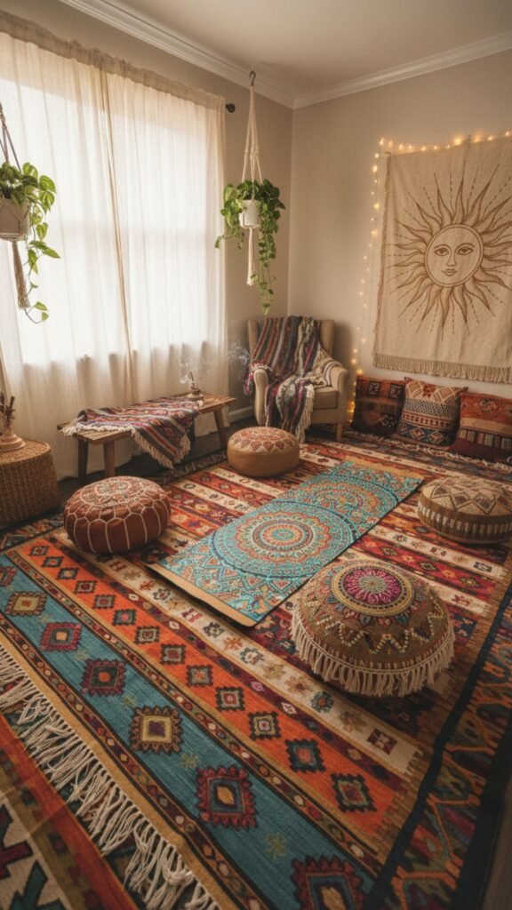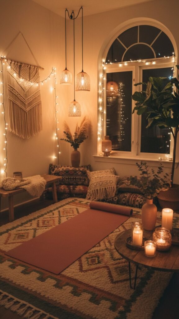 Layer patterned throws, embroidered pillows, and textured blankets to create depth. This cozy approach works especially well for restorative yoga and stretching routines.