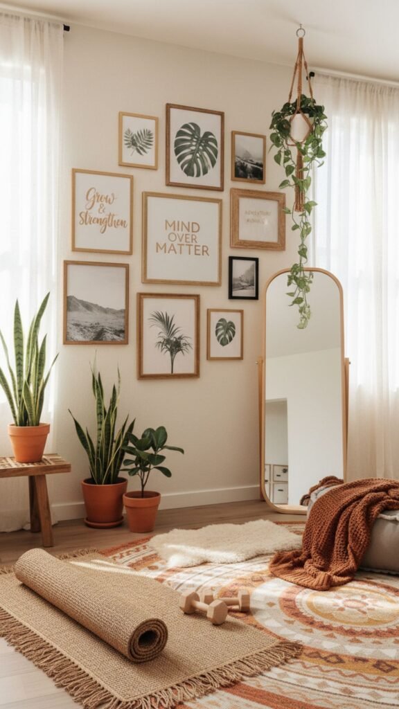 Surround yourself with motivational quotes, travel photos, and artwork that inspires movement. A well-curated gallery wall makes your workout space uniquely yours.
