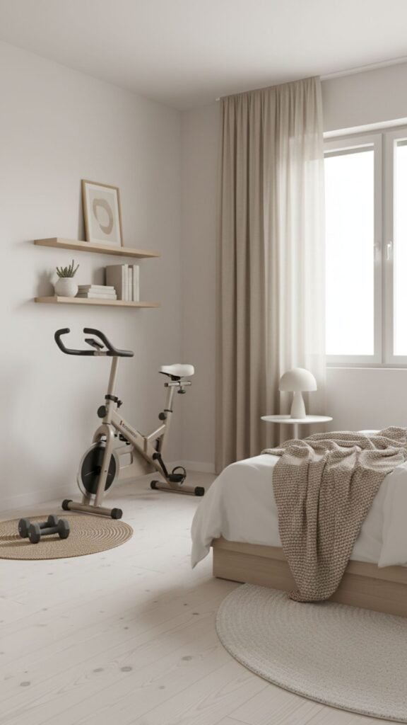 Keep it simple with neutral tones, clean lines, and multi-functional furniture. A folding exercise bike or sleek dumbbells blend seamlessly into this understated design.