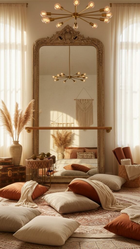 A large vintage mirror not only expands your space visually but also helps you check your form during workouts. Pair it with antique-inspired accents for that authentic boho vibe.
