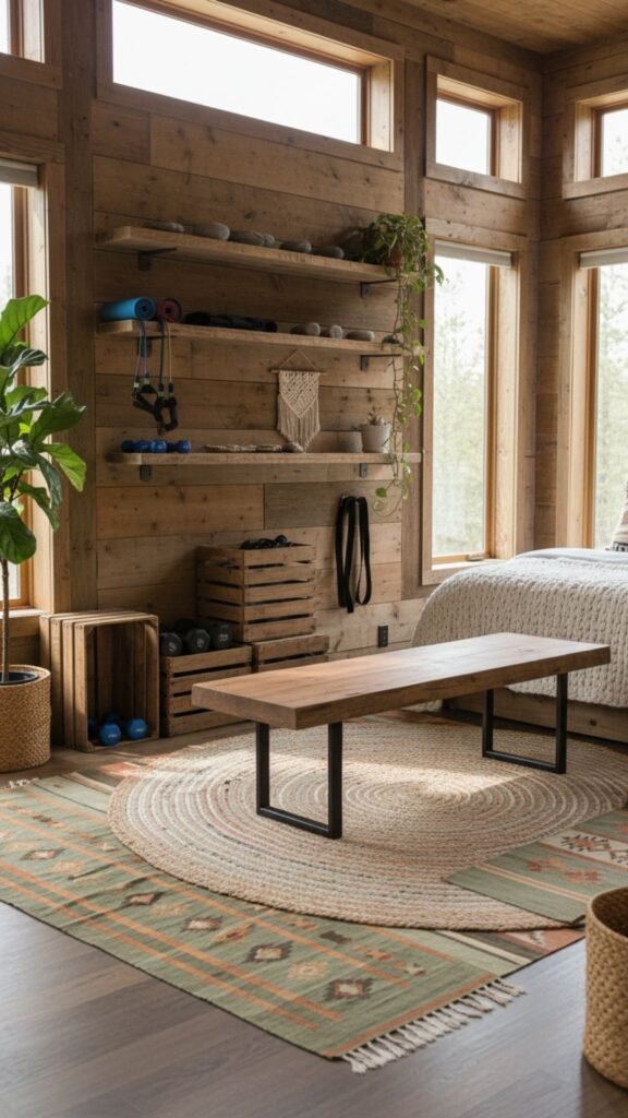 Wooden beams, reclaimed shelving, and natural finishes add warmth and character. This style pairs beautifully with kettlebells and resistance bands stored on open shelves.