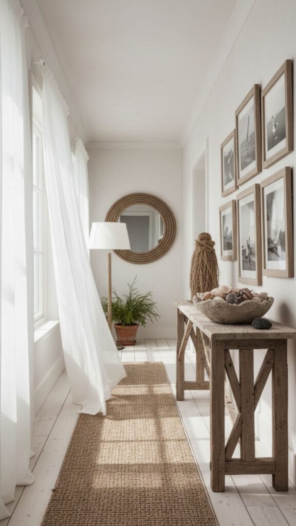 Sun-faded whites paired with raw driftwood create that effortless, weathered-by-the-sea feel. This look works especially well in narrow hallways that need a sense of openness.
