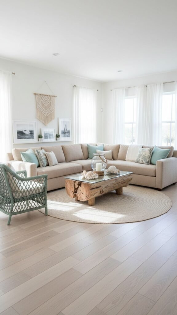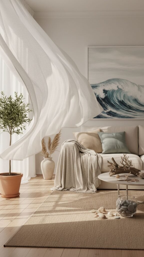 Start with light wall colors, sheer curtains, and minimal decor. A jute runner rug, a driftwood mirror, and a single piece of coastal art can transform even the tightest space without overwhelming it.