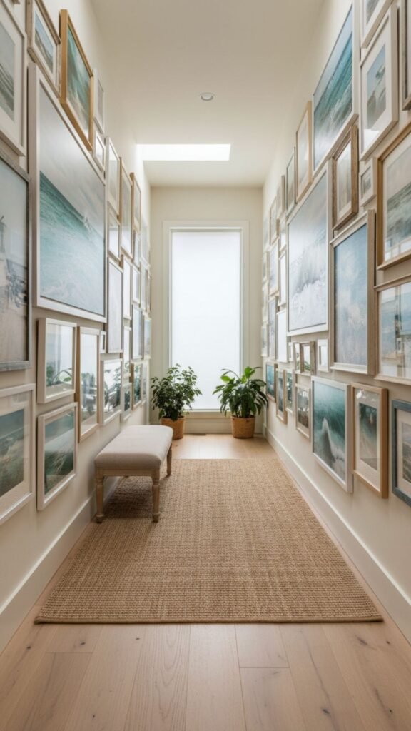 A curated gallery wall featuring ocean photography, botanical prints, and maps turns a plain hallway into a story worth stopping for.