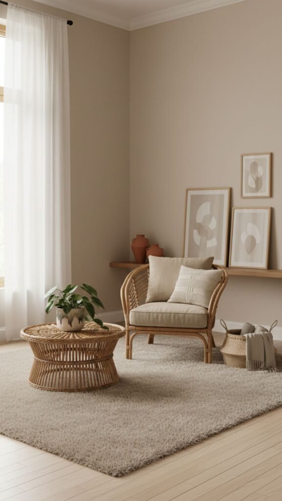 Think warm beige, cream, and taupe tones layered with natural rattan pieces. It’s effortlessly relaxed without feeling underdone.