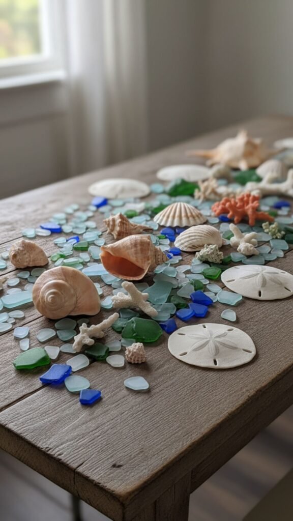 A carefully styled display of shells, corals, and sea glass adds personality without cluttering the space.