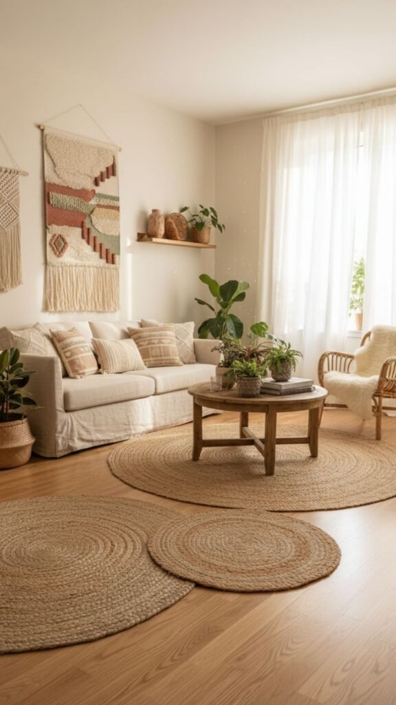 Natural fiber rugs and woven wall hangings ground the space beautifully while keeping the vibe relaxed.