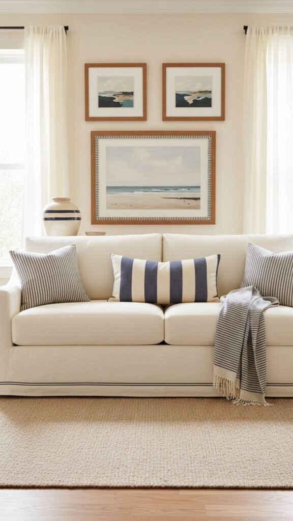 Classic navy and white stripes never go out of style in a coastal setting. The key is restraint—use them as an accent, not a backdrop.