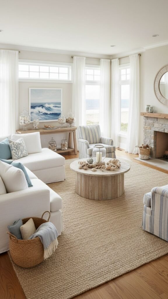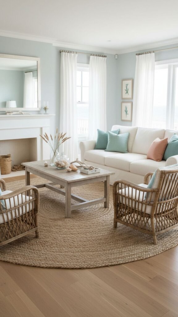 Natural fibers are the cornerstone of coastal design. Jute, sisal, seagrass, and soft cotton blends are excellent choices because they bring organic texture and durability to the room while mimicking the look of sand and driftwood.
