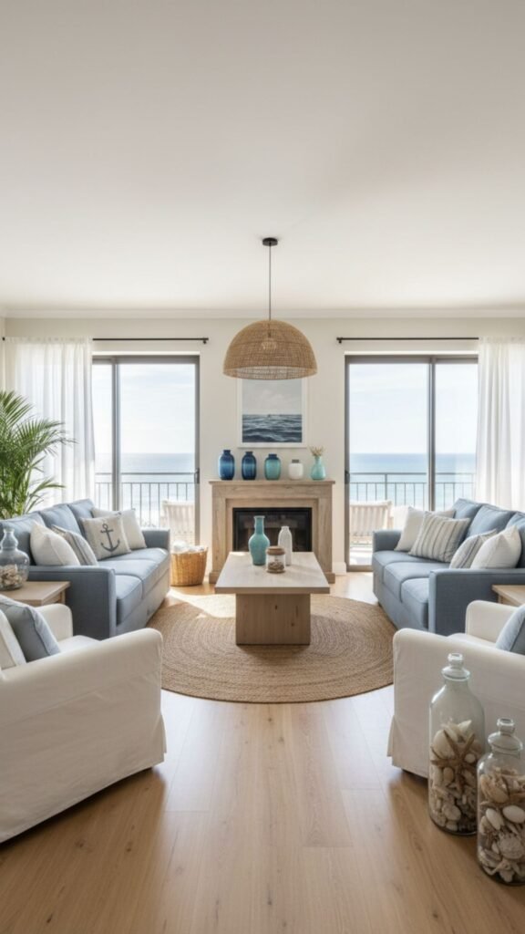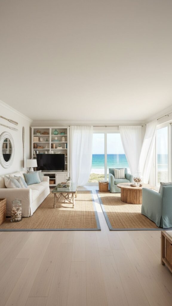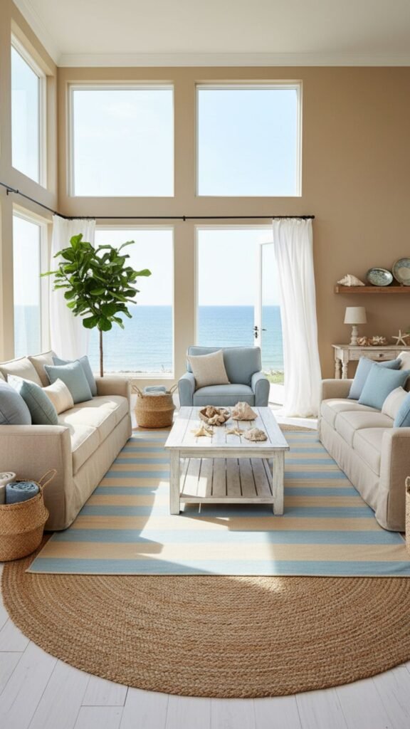 To maximize the feeling of expansive, sandy beaches, you can use a massive rug that nearly covers the entire room. This makes a small living room feel significantly larger and highly comfortable.