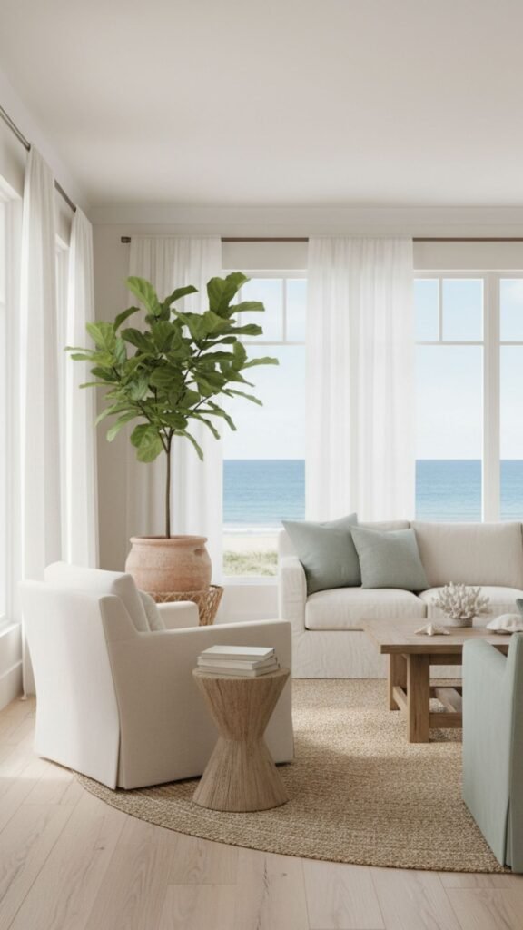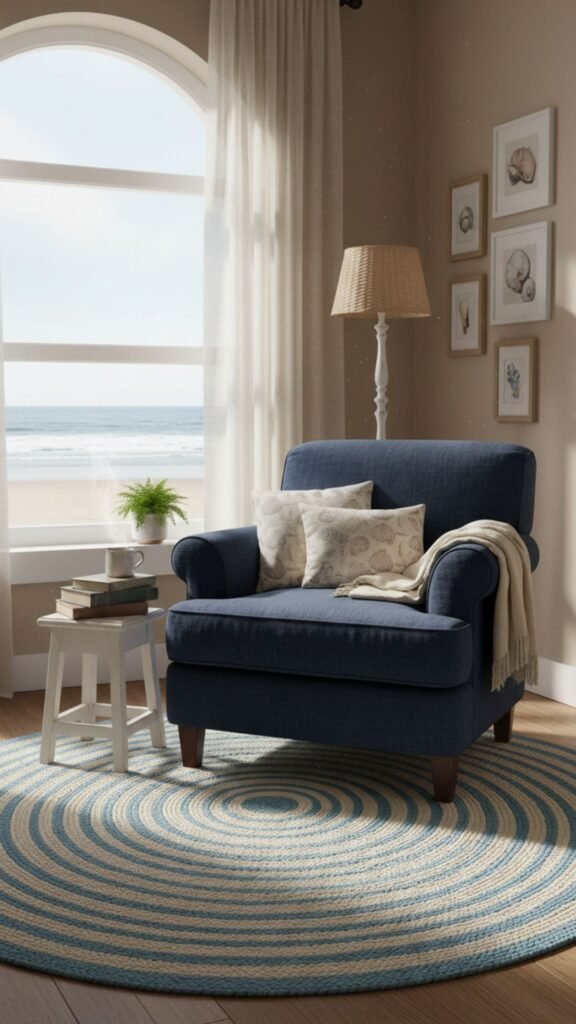 Coastal design often incorporates quiet corners for relaxation. A round rug softens the harsh angles of a room and creates a dedicated, intimate zone for reading or enjoying a morning coffee.