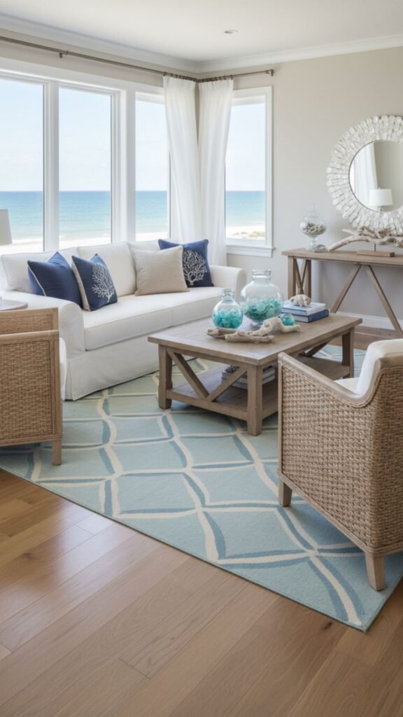 - Choose two medium-sized rugs in the same coastal color palette.