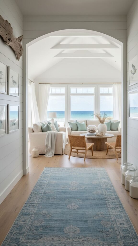 Walkways connecting the living room to other areas shouldn’t be neglected. A coastal-inspired runner eases the transition between rooms and carries the beachy aesthetic down the hall.