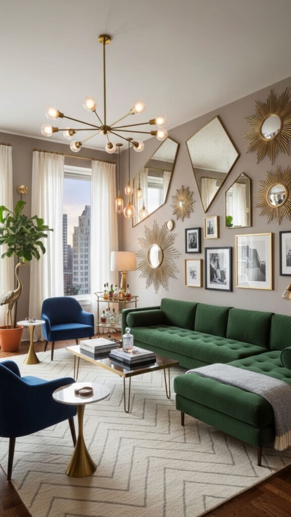 The geometric lines and glamorous finishes of the Art Deco period blend surprisingly well with other styles. Touches of polished brass, geometric mirrors, or lacquered finishes bring a hint of vintage luxury. These elements catch the light and brighten the room.