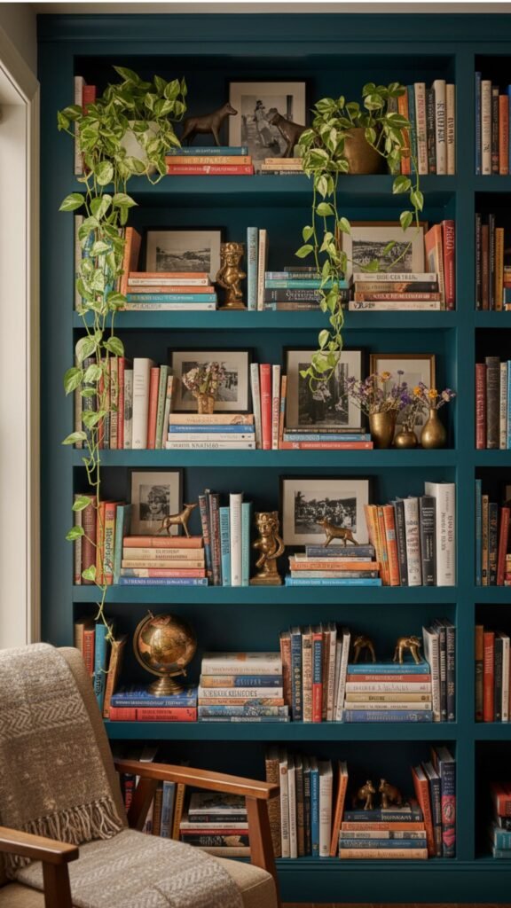 Your bookshelves should hold more than just books. Integrating art, sculptures, trailing plants, and personal mementos among your reading materials creates a curated, lived-in feel. It transforms a simple storage unit into a display of your life’s journey.