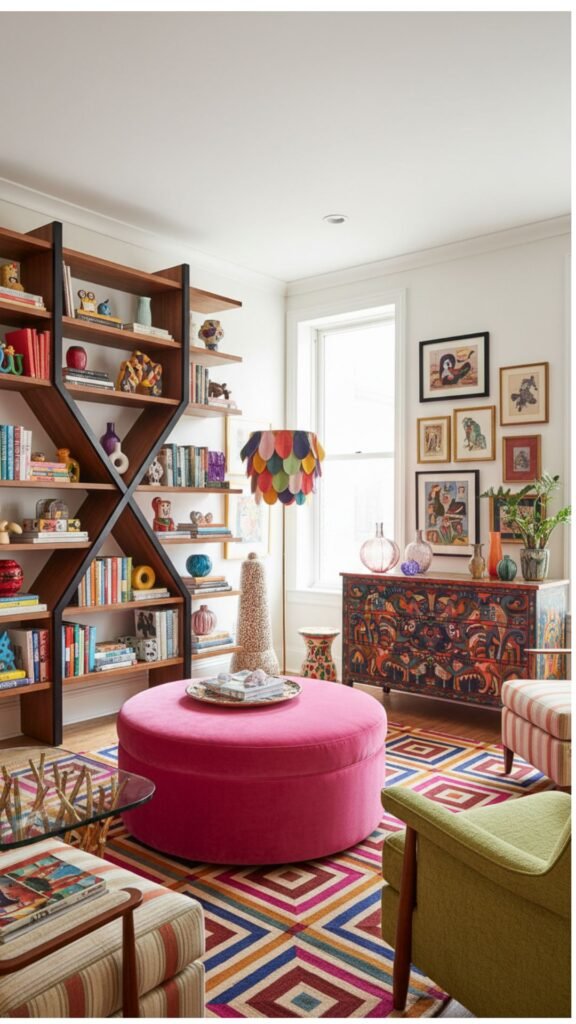 Every eclectic room needs one piece of furniture that breaks the rules. This could be an asymmetrical bookshelf, a bright pink velvet ottoman, or a hand-painted credenza. It injects a sense of humor and whimsy into the space.