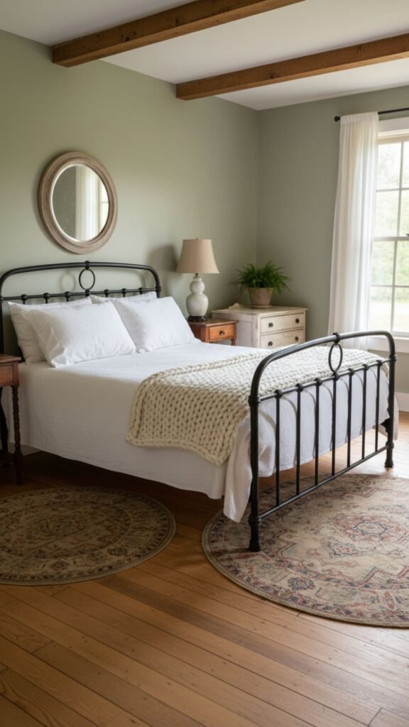 A wrought iron or metal bed frame anchors your farmhouse bedroom with vintage charm. Choose frames with detailed scrollwork or simple lines, depending on your style preference.