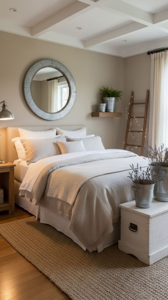 Incorporate galvanized metal pieces for an authentic farmhouse feel. These industrial touches balance the softer elements in your bedroom design.