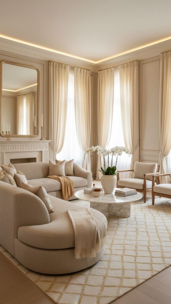 Relying on a strict palette of creams, beiges, and soft golds, this look emphasizes texture over color. Silk rugs, cashmere throws, and linen upholstery blend seamlessly to create a serene, luxurious environment.