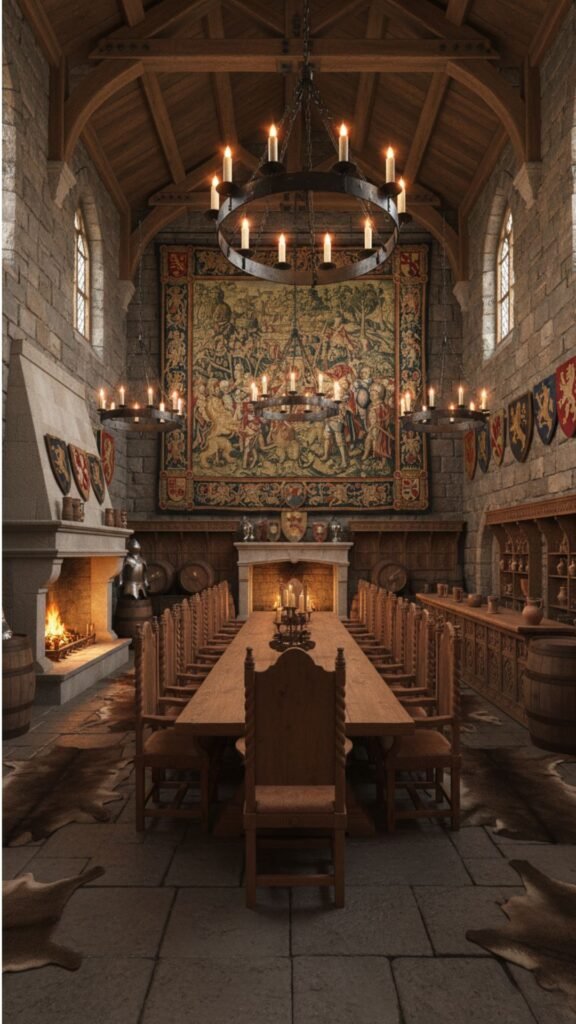 A large, antique wall tapestry commands attention and sets a medieval, baronial tone. Heavy oak furniture and wrought iron details complement the woven artwork, grounding the room in deep historical roots.