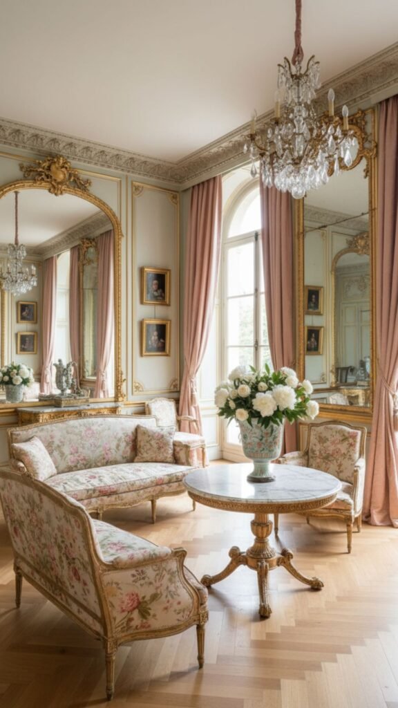 Soft pastels, gilded mirrors, and Louis XVI-style furniture bring Parisian elegance right into your home. Parquet flooring and silk drapery elevate the space, making it feel airy yet undeniably expensive.