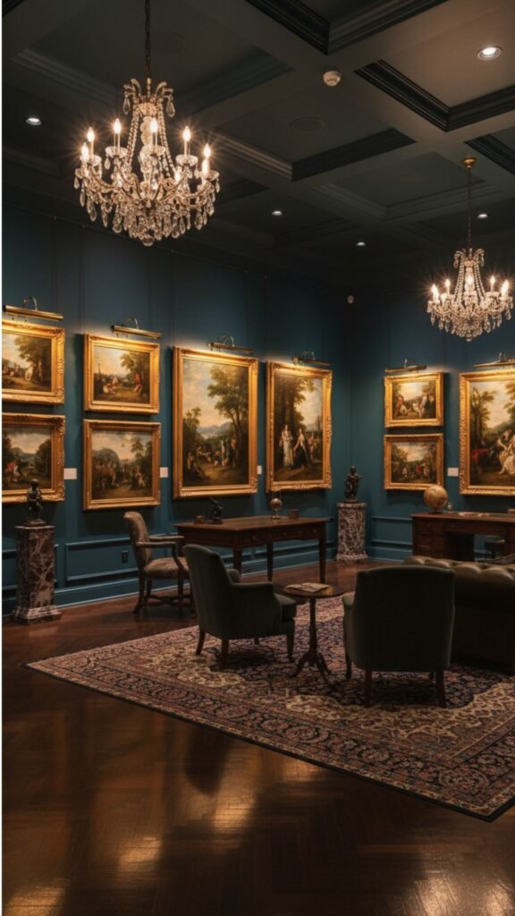 This design revolves around a curated collection of fine art displayed in ornate, gilded frames. Dark, moody wall colors allow the oil paintings to pop, creating an atmosphere reminiscent of a private museum.