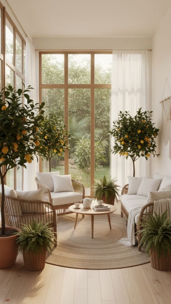 Large architectural windows allow natural light to wash over indoor citrus trees and potted ferns. Rattan furniture paired with crisp white linen cushions offers a relaxed, summery take on heritage wealth.