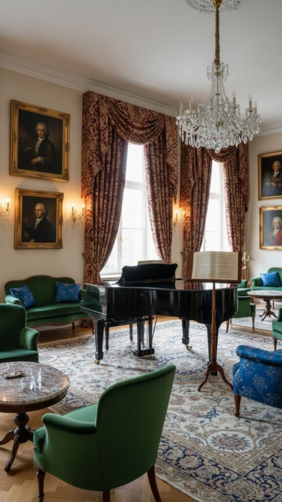 Intricate crown molding and ceiling medallions serve as the perfect backdrop for a sparkling crystal chandelier. Velvet seating in deep jewel tones adds a layer of opulent texture that feels historically accurate and lavish.