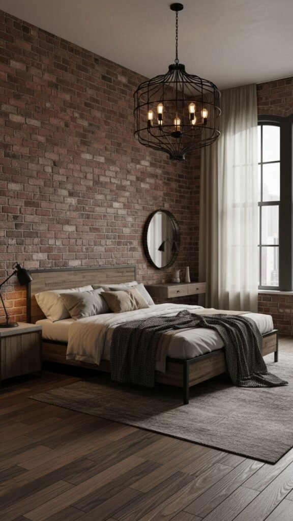 An industrial cage chandelier brings raw, edgy sophistication to your bedroom. Perfect for loft-style spaces or anyone who loves mixing rugged with refined.