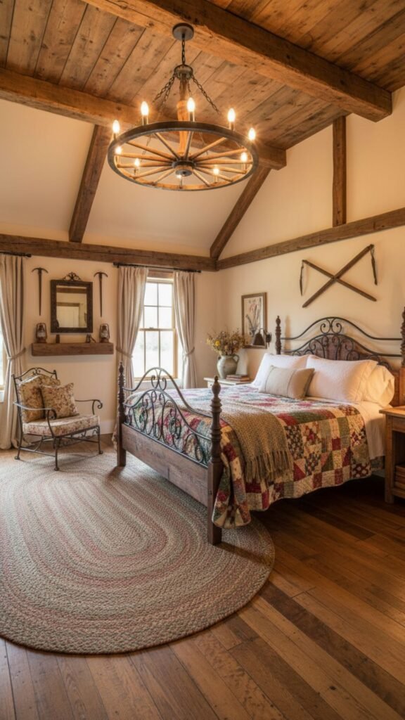 Bring country charm to your bedroom with a wagon wheel chandelier. This style pairs beautifully with shiplap walls and reclaimed wood furniture.
