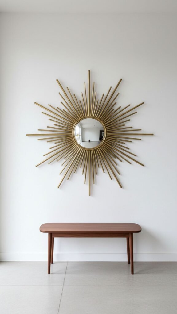 A classic sunburst mirror instantly commands attention as you walk through the door. Its metallic spokes contrast beautifully against a solid-colored wall, creating a glamorous yet structured vibe. This iconic mid-century piece bounces light around the room, making small foyers feel larger.