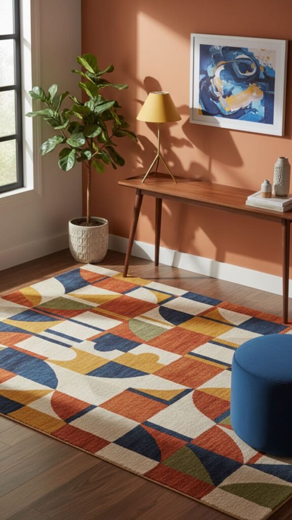 Anchor your entryway layout with a patterned rug. Low-pile rugs featuring asymmetrical shapes or simple line art tie the retro color palette together while protecting your floors.