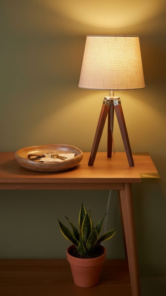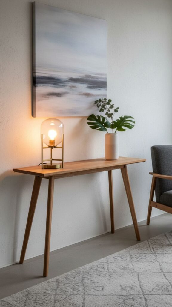 Furniture with tapered, angled legs is a hallmark of mid-century design. A slender console table provides practical storage while maintaining a visually light footprint. Warm walnut or teak finishes bring natural beauty into the entry space.