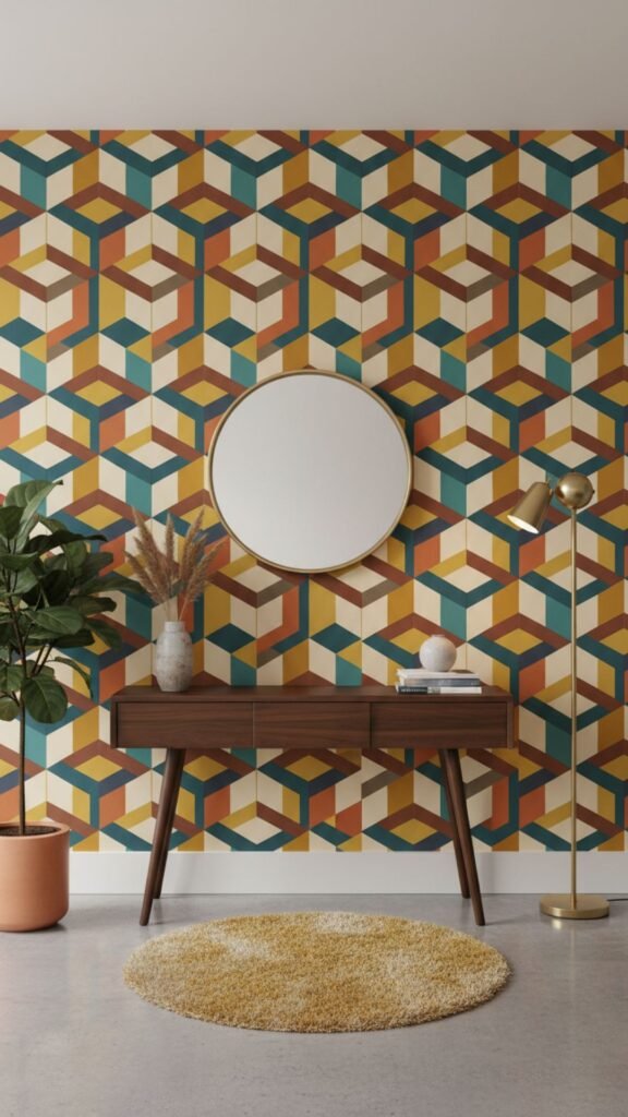 Bold, repeating patterns defined the 1960s aesthetic. Applying geometric wallpaper to just the entryway wall creates a distinct zone without overwhelming the adjacent living room. Stick to a palette of mustard, teal, or burnt orange.