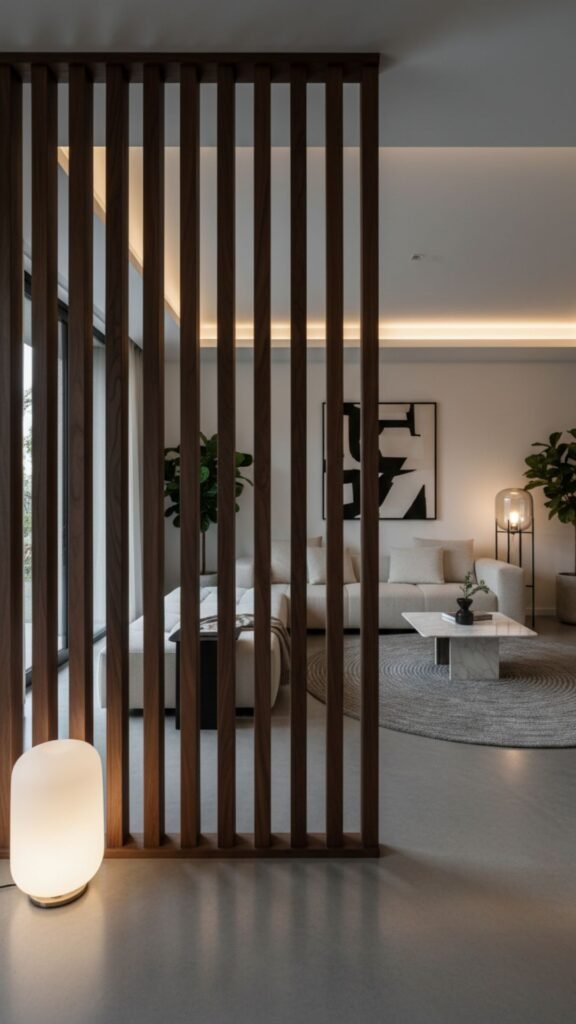 Open floor plans benefit greatly from slatted wood dividers. These functional pieces create a visual boundary between the front door and the living room while allowing natural light to flow through.