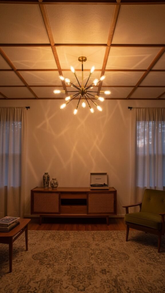 Lighting makes a powerful first impression. A sputnik-style chandelier, characterized by its exploding star shape and exposed bulbs, adds immediate retro drama to your entryway ceiling.