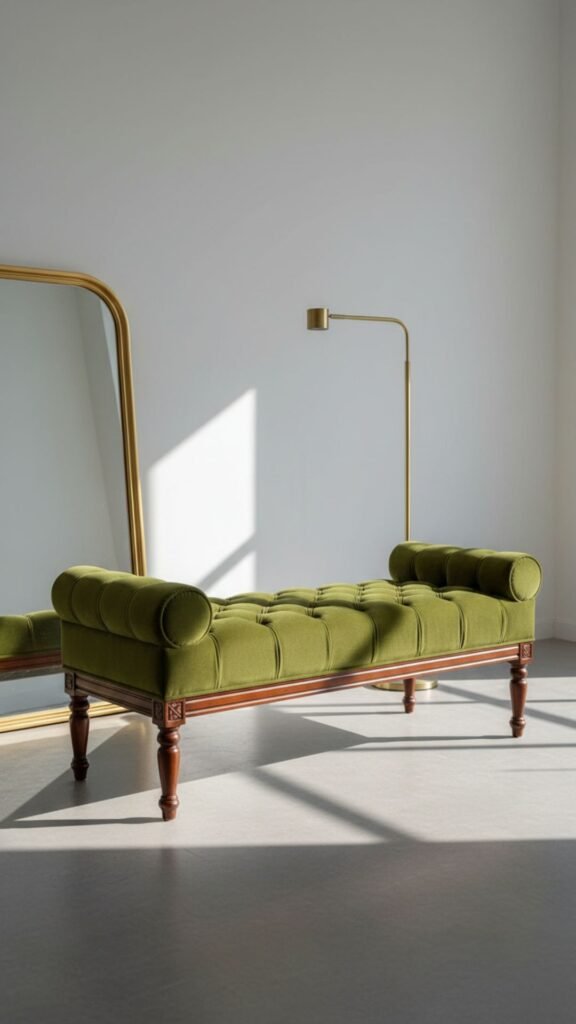 - Choose a bold velvet fabric like olive green, navy, or mustard yellow.