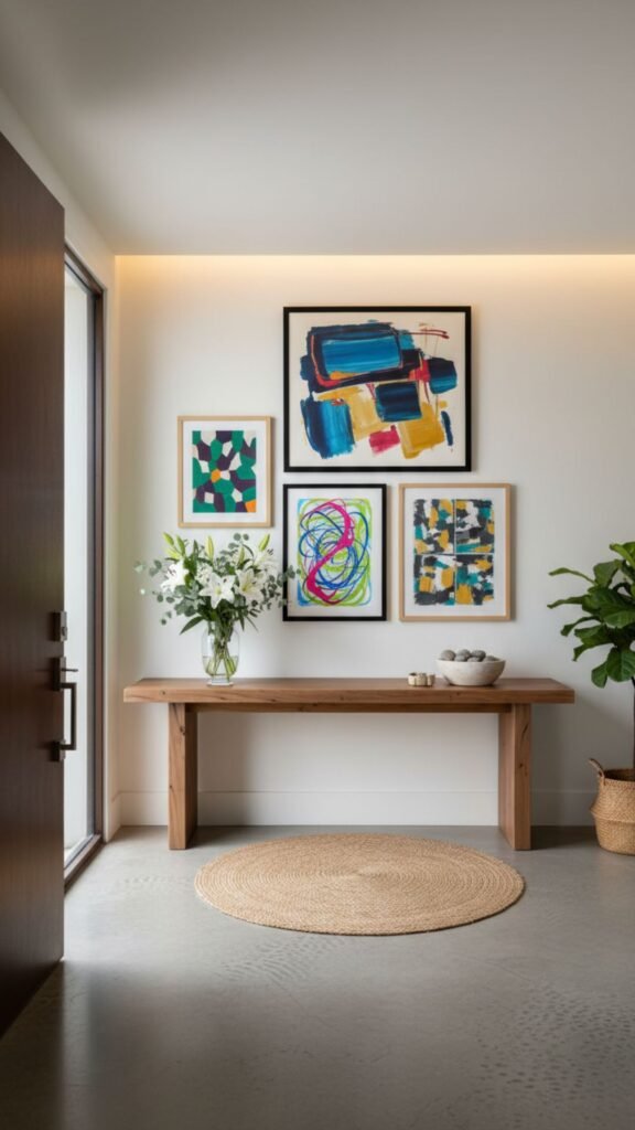 Mid-century homes often featured bold, abstract artwork. Curating a small gallery wall in the entryway injects personality and vibrant color into the space right away.