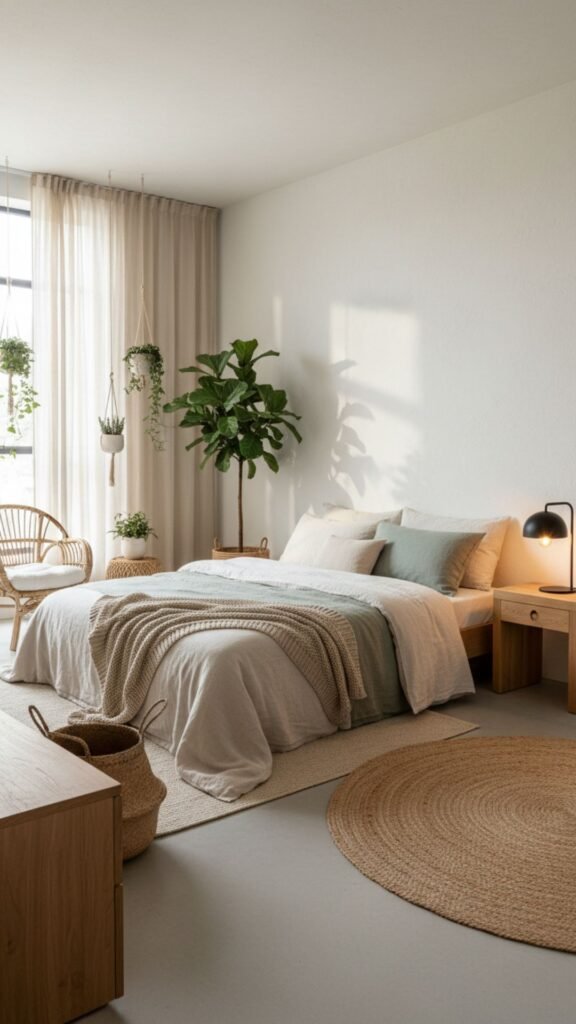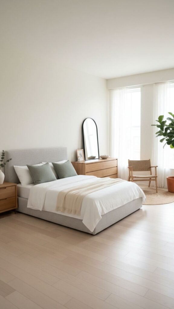 Add warmth through layered textiles like textured throw blankets, plush area rugs, and soft bedding. Incorporate natural materials such as wood furniture and woven baskets. Use warm lighting with dimmers to create ambiance, and include a few carefully chosen plants to bring life to the space without compromising the clean aesthetic.