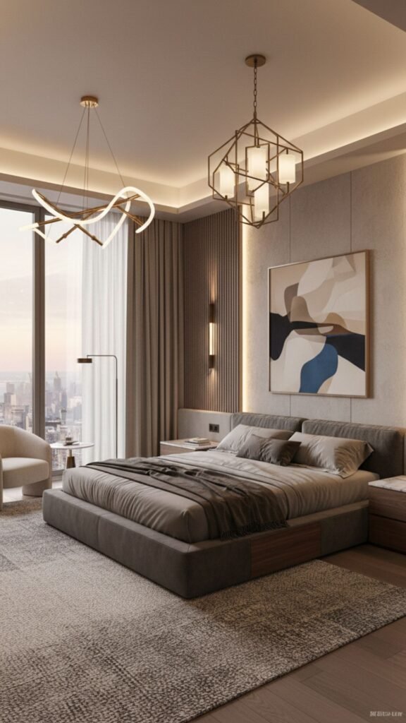Lighting plays a crucial role in modern bedroom design. Sculptural pendant lights, geometric chandeliers, or sleek floor lamps serve as functional art pieces that illuminate your space while adding visual interest.