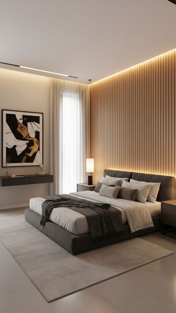 Add dimension to your modern bedroom with textured wall treatments. Wood paneling, textured wallpaper, or three-dimensional wall panels create focal points that enhance the room’s sophisticated aesthetic without cluttering the space.
