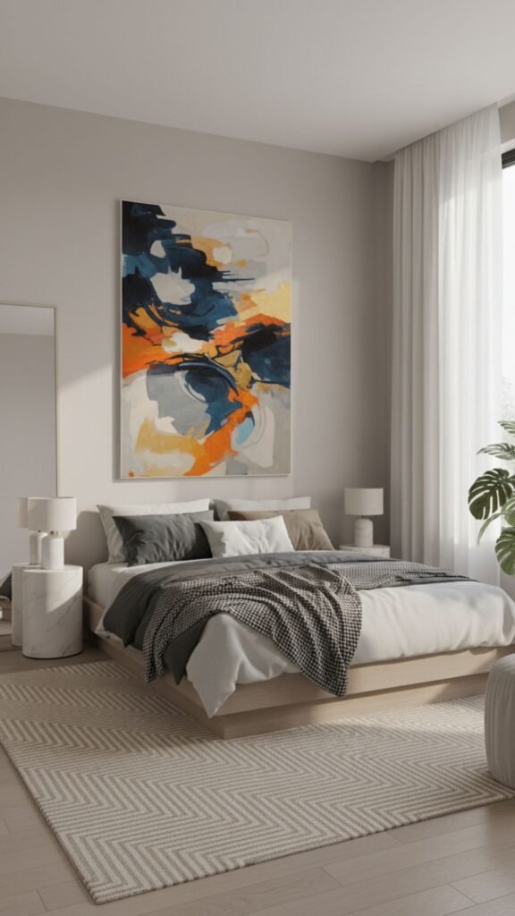 A single oversized piece of art makes a powerful statement in modern bedrooms. This approach follows the “less is more” philosophy while adding personality and creating a focal point above the bed or on an empty wall.