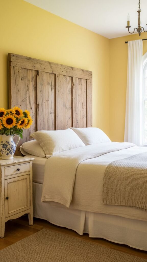 Brighten up your bedroom by pairing soft yellow walls with the rugged charm of reclaimed wood. A heavy, distressed wood headboard anchors the space and tones down the brightness of the walls. Adding subtle floral elements like sunflower arrangements brings a touch of nature indoors.