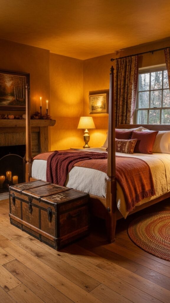 Deep amber-yellow walls evoke the feeling of a late autumn sunset. Placing a weathered vintage trunk at the foot of the bed provides practical storage and undeniable rustic charm. The leather and brass details of the trunk complement the rich wall color beautifully.