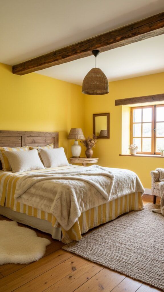 Yellow brings immediate warmth and energy to any space. It serves as a surprisingly perfect backdrop for rustic interior design. By combining the cheerful glow of yellow walls with natural textures, weathered woods, and vintage accents, you create a cozy, inviting retreat.