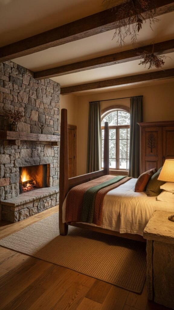 Ocher is an earthy yellow that feels deeply connected to nature. Pairing this color with natural stone accents, like a stone fireplace or stone-topped nightstands, elevates the rustic cabin feel. It creates a space that feels grounded and permanent.