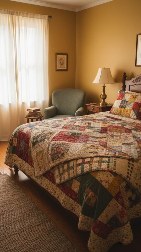 - Drape a patchwork or stitched heirloom quilt over the foot of the bed.