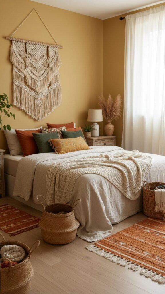 Honey yellow walls radiate a sweet, soothing warmth. Adding woven macrame details introduces a bohemian-rustic blend that feels relaxed and highly textured. This style relies heavily on tactile elements to make the room feel inviting.