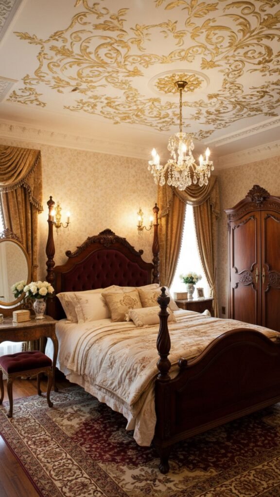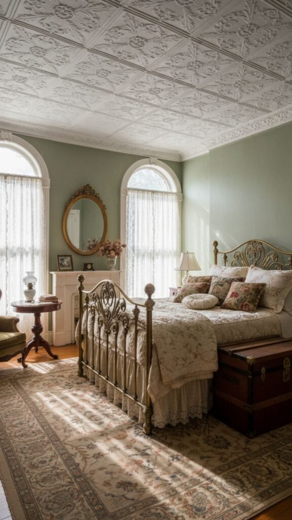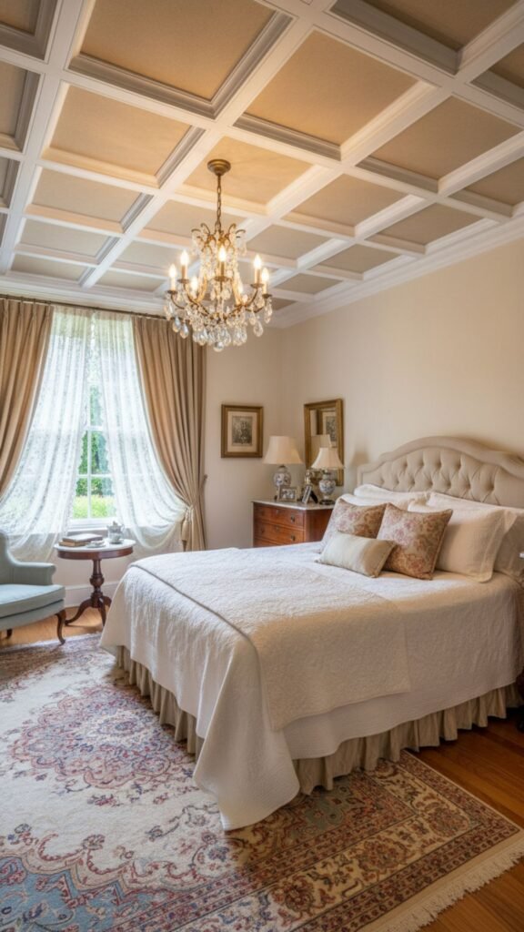 Coffered ceilings feature a grid of sunken panels that add instant depth and sophistication. Historically found in libraries and grand halls, they bring a structured, elegant feel to a vintage bedroom.